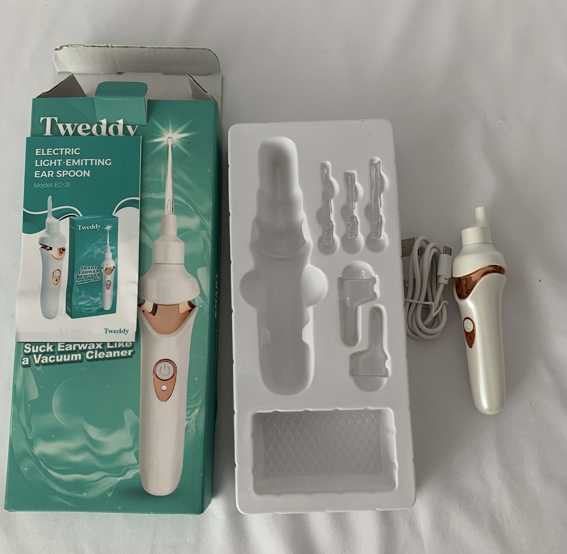 [Premium Material]-- Ear Wax Removal Kit is made of ABS and soft rubber scoop tip, the soft, elastic material quickly absorbs the dirt in the ear for a soft and comfortable cleaning experience. [Electric Ear Suction Set]-- This tweedy ear wax remover uses a high-quality motor, super suction, can easily remove earwax powder and agglomeration, the average practical life can reach 30,000 hours, USB charging design, to meet the needs of the whole family to clean the ear canal. [Easy to Use]-- Just push the switch and LED switch and gently insert it into the ear. Find the area where you feel itchy, it will vibrate your earwax slightly, then move slowly to clean the earwax. Suitable for the elderly, adults and children, it can clean the ear canal painlessly. [Comfortable Ear Spoon Head and LED Light]-- Vacuumear wax removal kit has double size soft tip, suitable for both adults and children. The built-in LED light is on, it is convenient to check the condition of the inner ear when cleaning, and avoid damage to the ear canal due to insufficient light.
